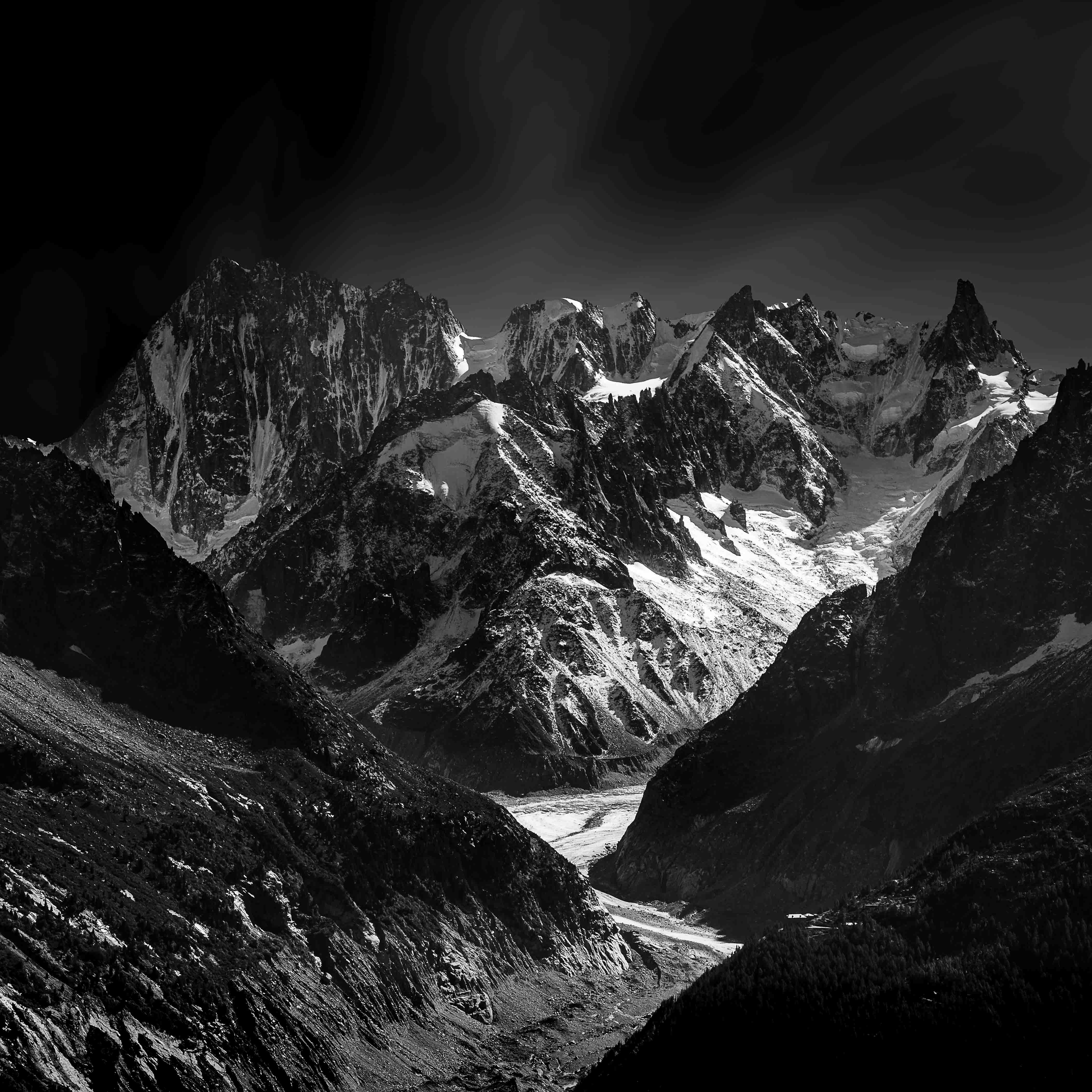 The Mer de Glace in the Mont Blanc massif in B/W.