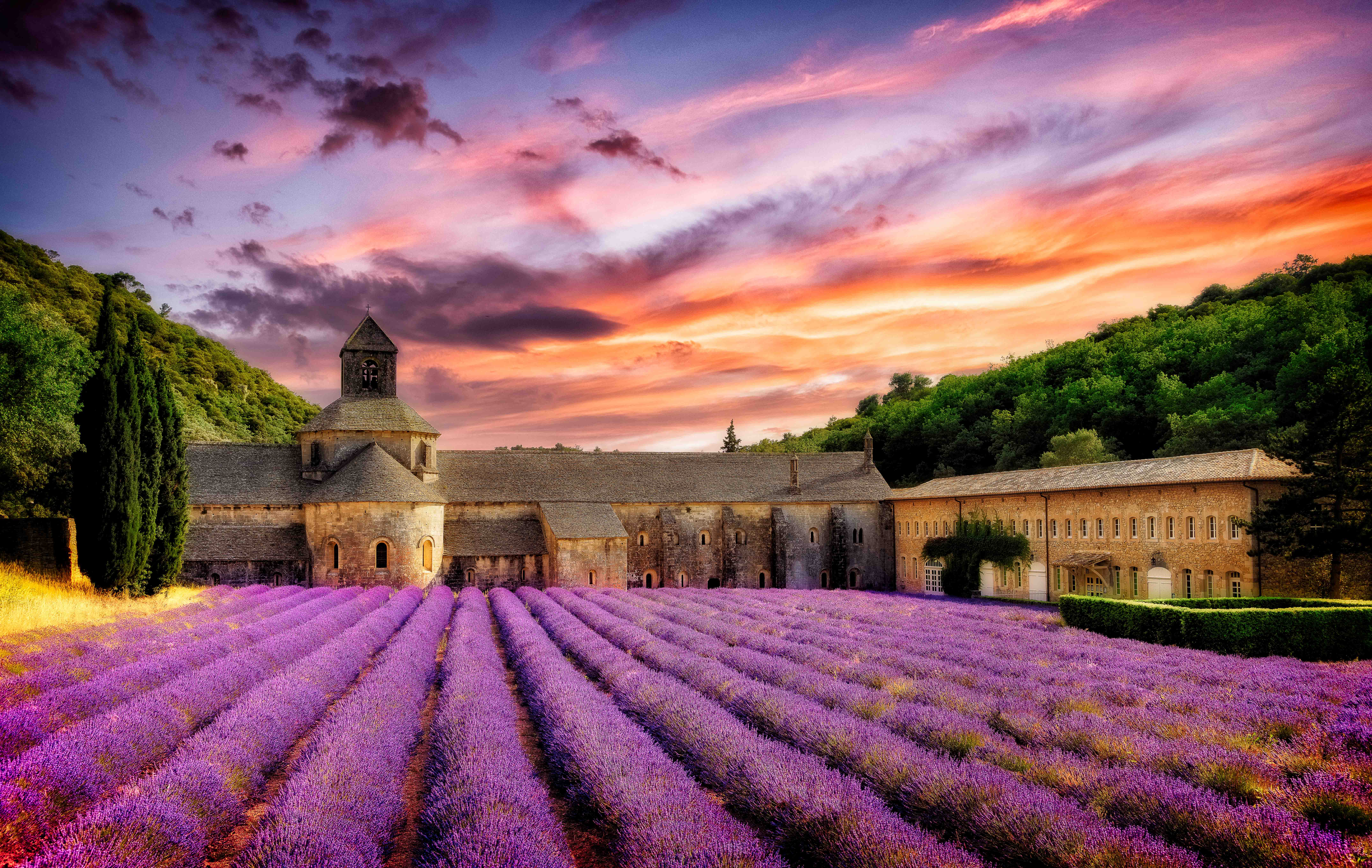 Abbey of Senanque blooming lavender flowers on sunset. Gordes, Luberon, Provence, France.